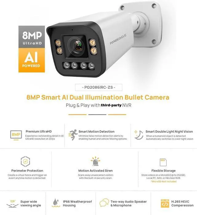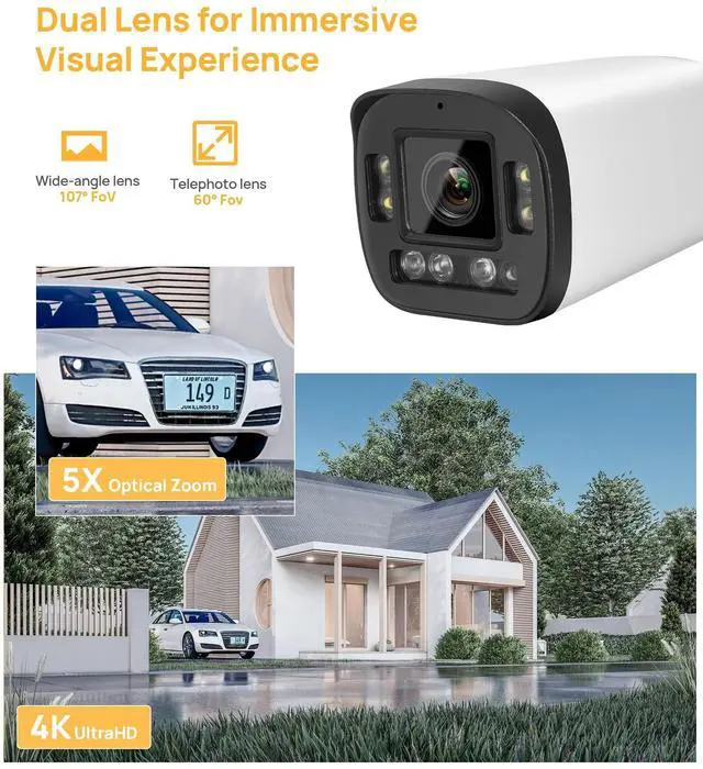 DUAL ILLUMINATION: This 8mp poe ip bullet camera equiped with 1/ 2.8P rogressive Scan CMOS 8MP (38402160) @20fps CMOS provides ultra stunning image quality the whole day. Equips with smart dual illumination(Built-in 4 warm lights and 4 IR LEDs), provides incomparable colorful video up to 98ft even in the environment of 0 illuminance and guarantee the crystal image effect. With 2.7 ~ 13.5 mm Motorized Varifocal Lens allows 5x optical zoom to capture more details. ^^ AI 4K BULLET IP CAMERA, 2-WAY
