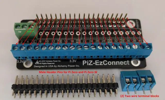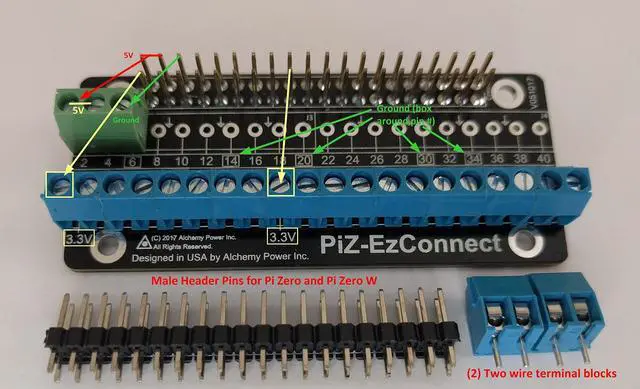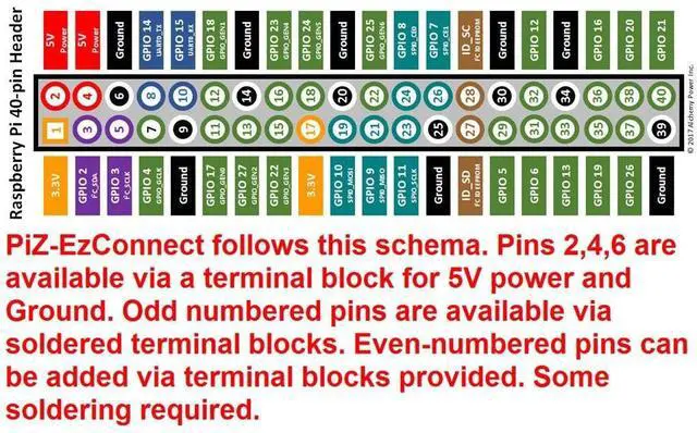 PiZ-EzConnect allows connection to any Raspberry Pi header pins via a terminal block. Any project that was done with a P 3 or a Pi 2 can now be done with a Pi Zero or Pi Zero W. The form factor follows the Pi-Zero dimensions (see image on dimensions included. ) PiZ-EzConnect is a nice, compact, easy to use board for connecting GPIOs or power to a Raspberry Pi. PiZ-EzConnect exposes the 40-pin header available on a Raspberry Pi. All odd numbered pins are accessible via terminal blocks. Pins 2, 4 and 6 are exposed via a soldered terminal block as those pins provide Power and Ground.