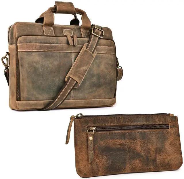 LEATHER VILLAGE Leather messanger bag Borwn color with Leather Pouch for Pencil - Set of 2 Laptop Bag & Pencil Case