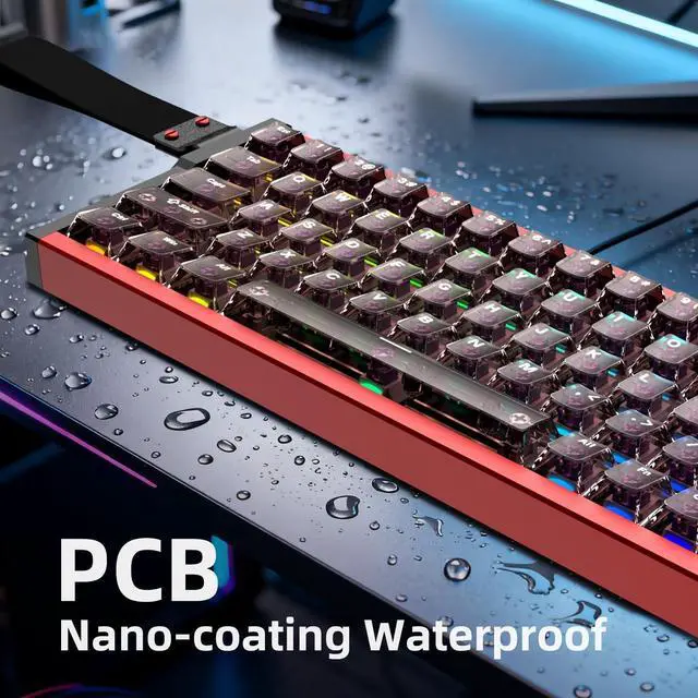 PCB Nano-coating Waterproof: IROK MG68Plus keyboard euquppied nano-waterproof coating adheres to the PCB surface that makes it highly water-resistant. This provides crucial protection against accidental spills, rain, or humidity, significantly reducing the risk of liquid damage and short circuits. Essentially, it greatly enhances the keyboard's durability and longevity, ensuring reliable performance even in demanding environments.