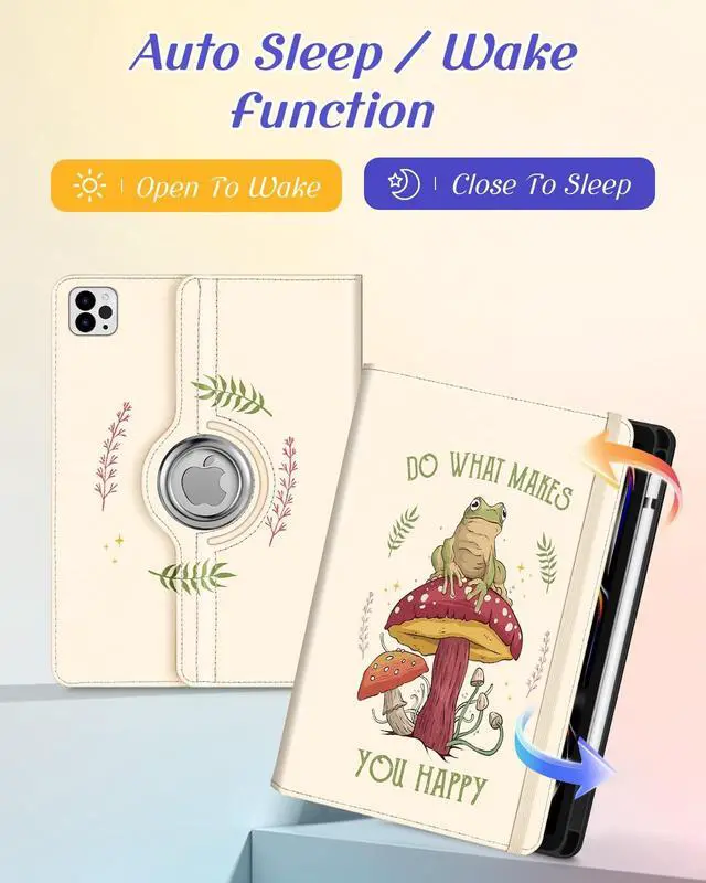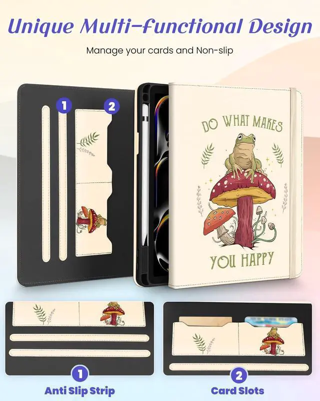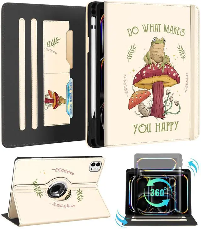 Kidcube for iPad Pro 11 Inch Case M4 2024 5th Generation - Women Girls Cute Rotating Stand Folio Cover with Pencil Holder & Card Slot Cool Frog Mushroom Design for iPad Pro 11'' Case 2024 M4 5th Gen