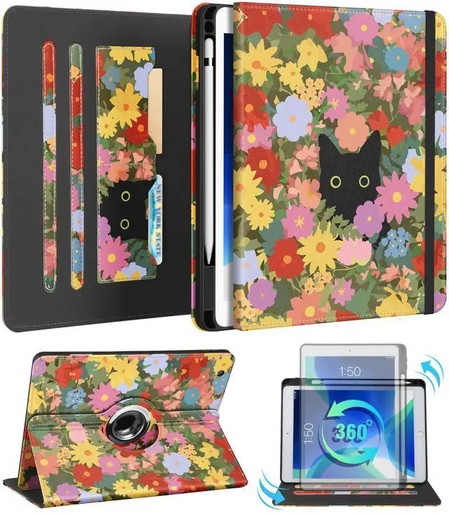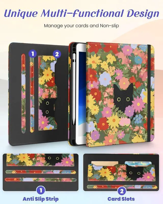 Multi-Functional Design: This for iPad case 9th generation/8th generation/7th generation features an elasticized cord strap, which ensures that your tablet closes securely, provides slip or drop protection. It also has two card slots designed to hold your bank cards business cards and other cards