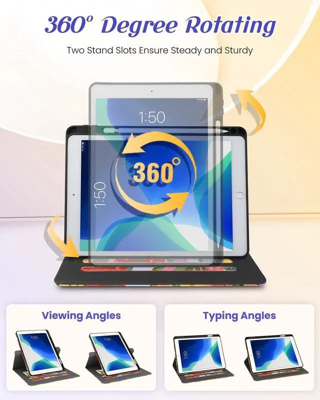 Rotating Stand: This for iPad 9th/8th/7th case with an functional rotating stand design, supporting your devices to switch between landscape and portrait orientations. While 2 anti-slip strip design allow for multiple horizontal stand angles for comfortable viewing or typing ^^