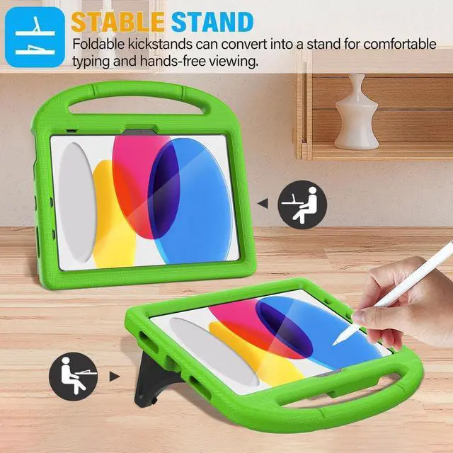 Generation 10.9 inch 2022(Model: A2696 A2757 A2777), NOT fit for iPad Air 4/5( 10.9" ). Please CONFIRM your iPad model before purchasing. ^^ Full-body ProtectionMade of durable, child-safe, lightweight, wear-resistant, shock-absorbing EVA material, protects your iPad from accidental drops and bumps. ^^ Built-in Screen Protector & Pencil HolderBuilt-in a clear screen protector prevents scratches and dirts, pencil holder allows you easy store and remove your apple pencil (Pencil NOT Included). ^^ Built-in Stand & HandleBuilt in a foldable kickstand, it can convert into a stand for comfortable typing and hands-free viewing, Non-slip handle is designed to be easy for kids to carry. ^^ Easy to UsePrecise cut-outs for buttons, ports and cameras, allows you easy access to all features without removing the case, you can also easy to install or remove this case.