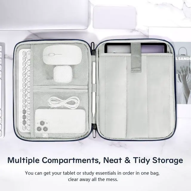 ^^ Multi-layer Space: The main large compartment is for a tablet, extra two mesh pockets with sufficient capacity for storing other tech essentials or accessories like your keyboard, cellphone, chargers, USB cables, computer mouse, power bank, earphone, bank cards and other personal subjects. Besides, front pocket for flash drive, notebook, pens or digital stuffs.