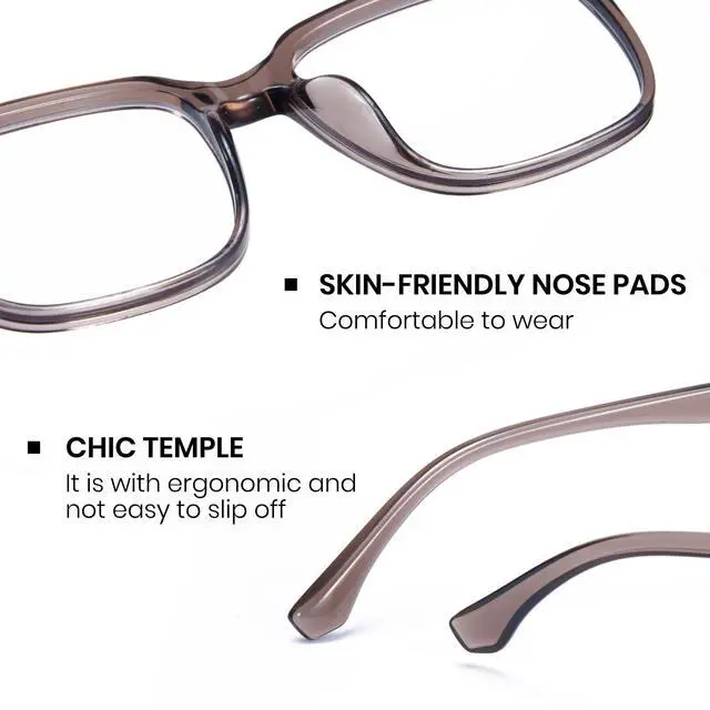 Lightweight and Durable TR90 Frame: Crafted from ultra-lightweight TR90 material, these oversized square glasses are designed for all-day wear without pressure. The flexible frame gently adapts to your face, reducing temple tension and preventing nose bridge marks. At just a feather-light weight, they deliver lasting comfort whether youre worki