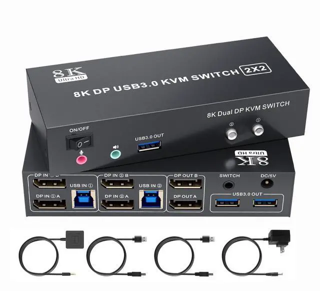 Display Port KVM Switch: This kvm switch 2 monitors 2 computers display port allows seamless control of 2 computers sharing 2 monitors and 3 USB 3.0 devices along with a single keyboard and mouse It supports flexible switching between extended mode (displaying different content on dual screens) and mirror mode (duplicating identical content) ^^ Ultra HD 8K