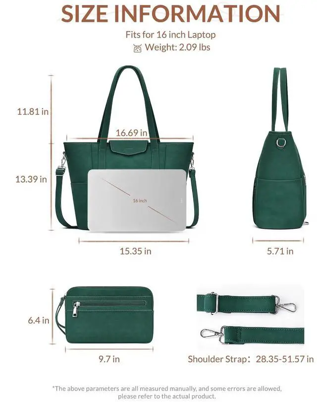 It can hold laptop, clothes, magazines, A4 files, keys, passports, phones and other items. The multi-pockets design keeps your everything in good order ^^ Comfortable Size- The laptop tote bag size: 16.69" - 15.35" W * 5.71"D * 13.39"H, weights 2.09 lbs with adjustable & removable 28.3551. 57"shoulder strap.