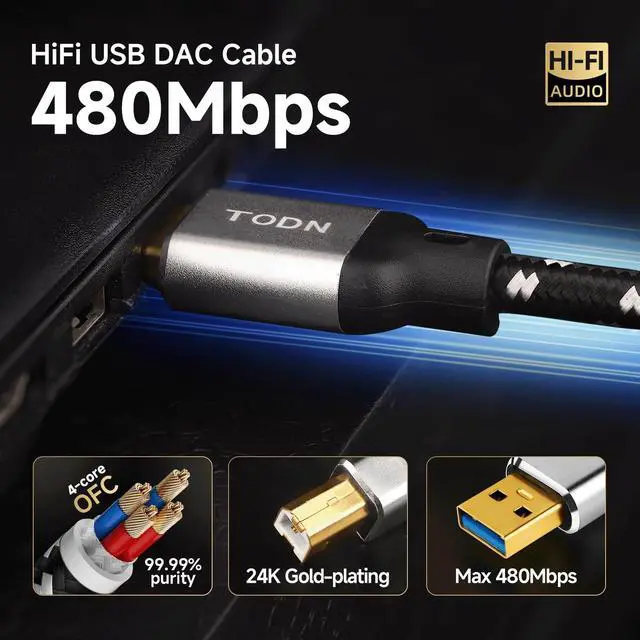 Powerful Bass: TODN AG-Series HiFi USB A to USB B feature 4-core OFC conductor that delivers strong bass and rich details, like heavy bass in electronic music. And 4-strand core increase the total surface area of conductor that improves high frequency performance more effectively than 2-core. Ideal for audiophiles who like powerful music, such as electro, rock and more! After 48 hours of burn-in, the signal transmission of the USB B is smoother and faster, perfect for computer to DAC/sound card ^^
