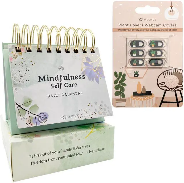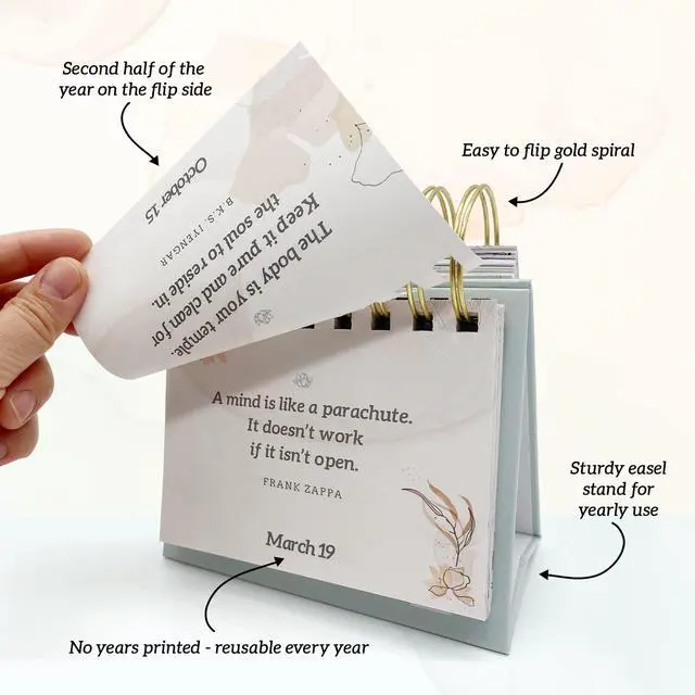 MESMOS Mindfulness Calendar Feature: 366 unique mindfulness quotes for each day of the year Gold spiral bound Sturdy easel stand Undated to use forever and save the planet Compact size perfect for desk decor L 5.25 x H 5.5 x W 1.5 inches (W 3.75 when easel is assembled) Beautiful box with water color and floral design