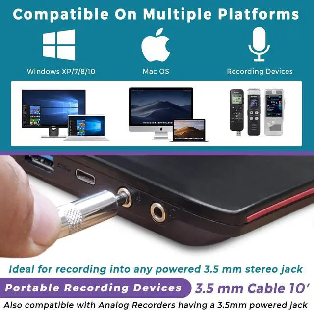 PERFECT ANGLES - Surrounded by 5 mm of thick metal tubing to provide unmatched flexibility and durability. ^^ ADJUSTABLE Contort this hands free microphone into any desired position to suit your recording needs. ^^ HANDS FREE RECORDING Free your hands from your dictation microphone with this premium holder. ^^ NOISE CANCELLING Focuses on the voice in front of the microphone and suppresses unwanted noise from the sides and back. ^^ WIDE COMPATIBILIY - Compatible with Windows, Mac, Computers, Digital Dictation Stations, Digital Portable recorders, analog recorders, laptops with a 3.5 mm female microphone power jack (input).