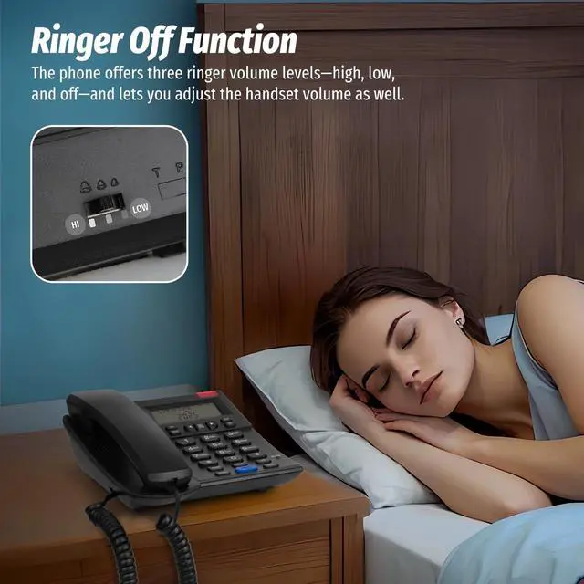 ^^ Adjustable Ringer Volume: With three adjustable ringer volume settingsloud, soft, or offthis desk phone offers the flexibility to suit any environment. Whether you need a loud ring to hear it across the room, a softer tone for a quieter space, or the option to mute it, you have full control. Ideal for landline phones, this feature ensures you never miss an important call while adapting to your needs.