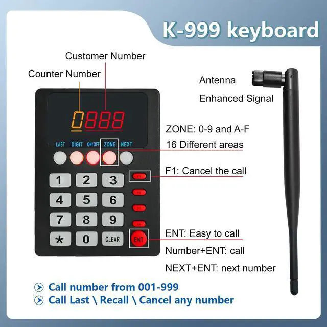 K-999 Keypad Specification: 1. Press number + ENT to call2. Press number + F1 to cancel this call3. Default first number is for counter (0-9/A-F), last 3-digit number for customer(001-999)4. Press NEXT + ENT can go to next number quickly. For example, last number is 456, you just need press NEXT + ENT, then keypad will call 457 automatically. You needn't press " 4 5 7 + ENT " one by one. 5.