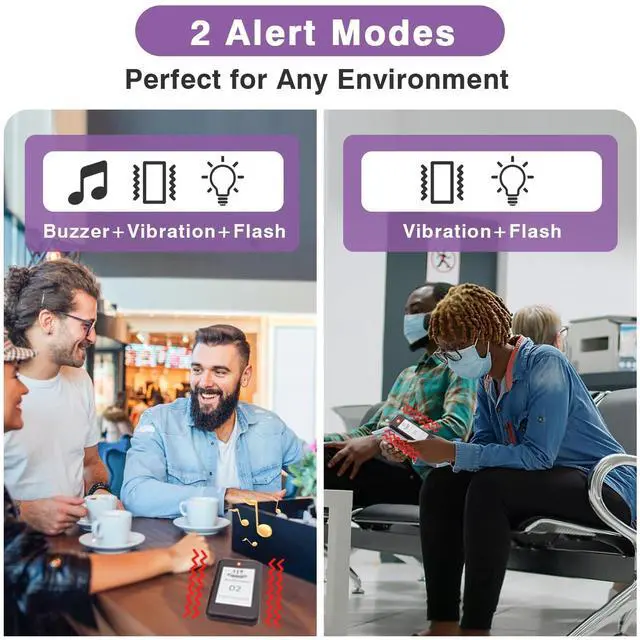 ALERT MODES: Our restaurant pager system with 2 modes: buzzer and vibration and flash; customer can hear the beep sound even at noisy restaurants; customer can turn off prompt sound; vibration and flash mode can keep the quiet environment of the clinic or hospital ^^