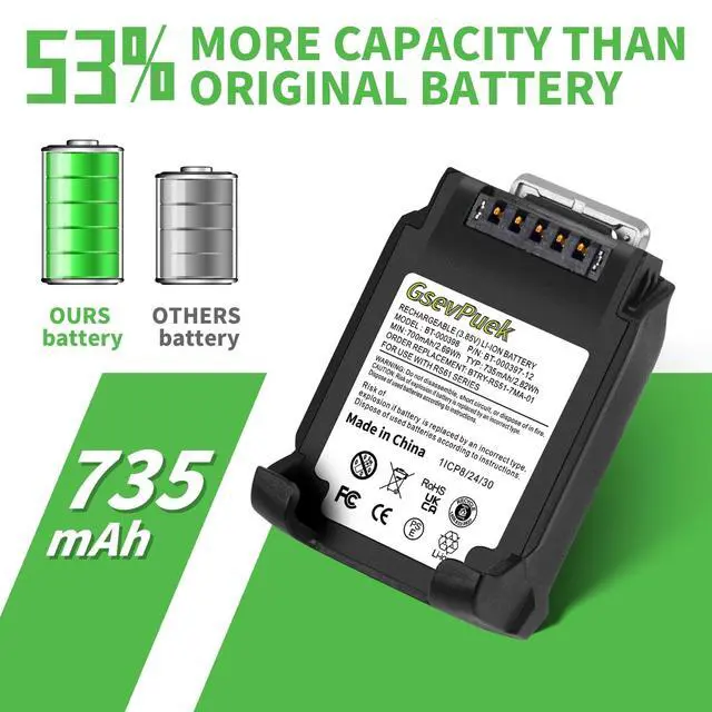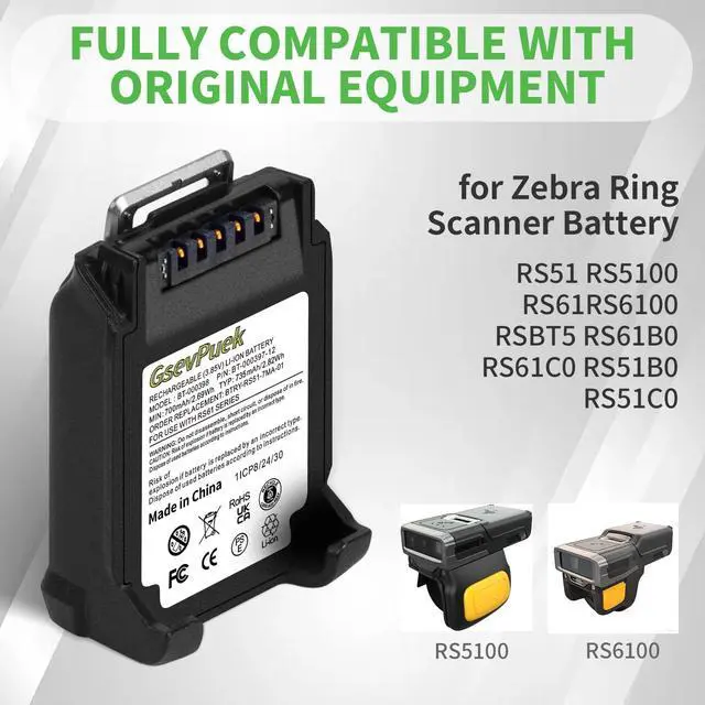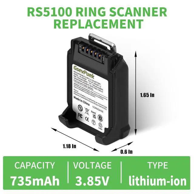 Zebra Ring RS5100 Scanner Battery: Specifically designed as a compatible replacement for zebra RS51, RS5100, RSBT5, RS61, RS6100, RS61B0, RS61C0, RS51B0, RS51C0 2D Bluetooth Ring scanner.