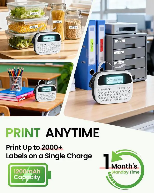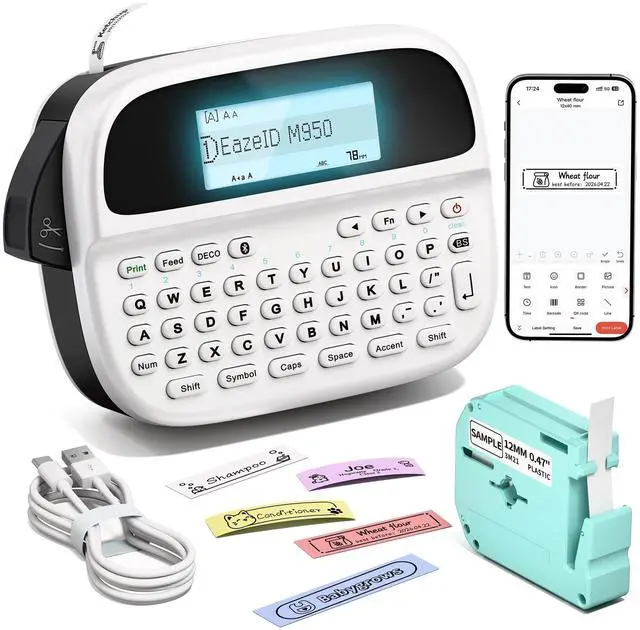 Two Printing Modes: Unlike traditional keyboard label makers, EazeID M950 portable mini label maker printer supports both QWERTY keyboard printing and Bluetooth connect to the "Print Master" app and gain free access to a vast library of customizable label templates. The app supports over 1000 patterns, 100+ frames, 100+ fonts, barcodes, and QR codes ^^ Rechargeable Portable Bluetooth Label Maker - No More Battery Waste - Built-in 1200mAh lithium battery provides hours of continuous use. Includes USB-C charging cable and label tape roll. Compact handheld design with backlit LCD screen ensures clear visibility in any lighting condition ^^ Ergonomic QWERTY Keyboard for Comfortable Typing - Full-size keyboard layout with wider key spacing reduces typing errors and finger fatigue. Tactile feedbacks ensures accurate input for professional labeling. Ideal for users who prefer traditional typing over smartphone apps ^^ Versatile Labeling Machine for Home & Office Organization - Perfect for organizing storage containers, kitchen items, office files, school supplies, and personal belongings. This mini christmas label maker makes thoughtful gift for christmas, cool personalized teacher gifts for classroom, organization gifts for women, bulk office gifts, work from home gifts, customized gifts for kids, practical gifts for organized people ^^ Waterproof Label Maker with Advanced Protection - EazeID M950 label maker waterproof labels creates durable waterproof labels perfect for kitchen organization, and bathroom storage.