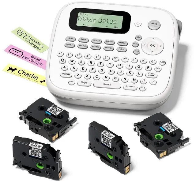 Personal Touch: The D210S label maker with tape offers multiple alternatives for pre-designed 800+ symbols, 100+ frames, and 16 different fonts. It even offers the ability to print barcodes, up to 4 lines of text, and allowing you to adjust font sizes (large, medium, small) to cater to all your labeling needs ^^ Label Maker with