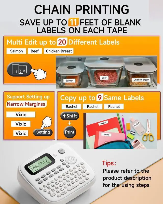 Blank Labels: The D210S handheld label maker features multiple editing functions and narrow settings. Allowing you to easily edit up to 20 different labels. With each 26.2 feet length tape, the D210S label maker machine with tapes enable you to efficiently print 264 labels ( 1.2 inch per label) and save up to 11 feet of blank labels ^^ Add your