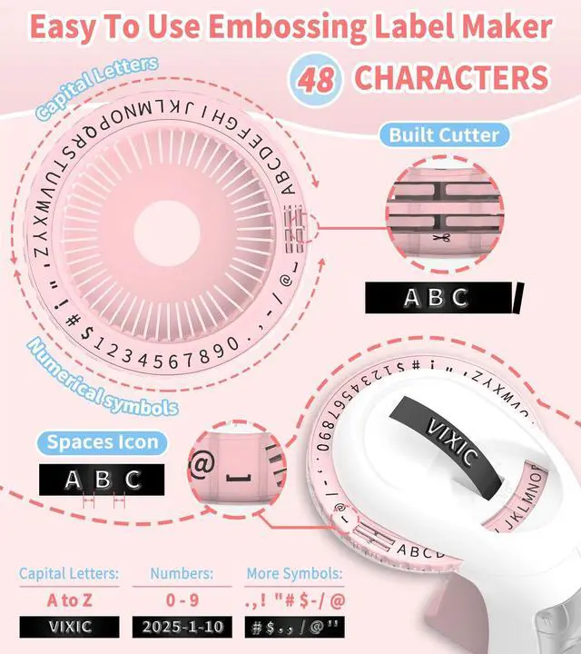 Ergonomically Designed Label Maker: The Vixic 3D Embosser Label Maker features an ergonomically designed handle for easy operation. The emboss label maker comes with a built-in cutting mechanism and pre-cut dividers for convenient label removal, while the dotted lines simplify the labeling process ^^