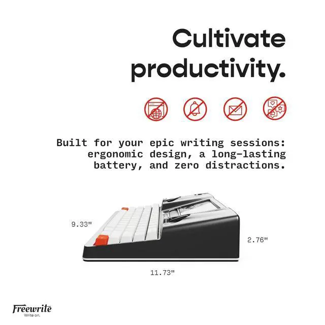 ELIMINATE DISTRACTIONS Always struggling to resist distractions (notifications, emails, internet browsing, social media, etc. ) when trying to write on your laptop? The Smart Typewriter by Freewrite is a digital typewriter that functions as a distraction-free word processor so you can truly focus and become absorbed in your writingnot some random corner of the web. ^^ GET IN THE FLOW, FAST Simply turn on the Smart Typewriter and let the words flow. Its intentionally minimal design helps you focus so you can compose your best work. With a blue light-free e ink display thats easy on the eyes in any lighting, you can draft wheneverand whereverinspiration strikes.