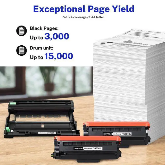 Estimate Cartridge Yield: TN830XL Toner is 3, 000 Pages Per Cartridge, DR830 DR-830 Drum Unit is 15, 000 Pages Per Drum Unit (Letter/A4, at 5% coverage) ^^ Compatible with Brother DCP-L2640DW, DCP-L2647DW, HL-L2400D, HL-L2405W, HL-L2420DW, HL-L2460DW, HL-L2460DWXL, HL-L2465DW, HL-L2467DW, HL-L2480DW, HL-L2865DW, MFC-L2760DW, MFC-L2807DW, MFC-L2820DW, MFC-L2820DWXL, MFC-L2900DW, MFC-L2900DWXL, MFC-L2980DW printer.