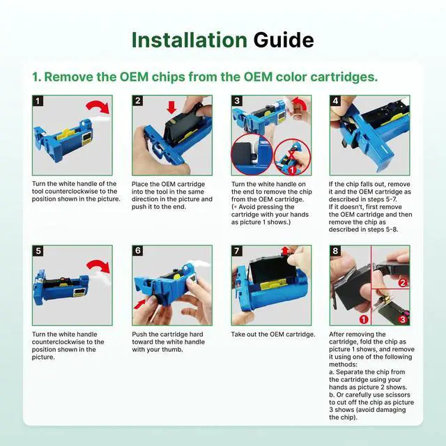Replacement Guide: 1. You need to remove the original chips on HP923 ink cartridges through our tool. 2. Peel off the tape of the new compatible cartridge and Stick the OME chips onto the tape. 3. Install the compatible 923 ink cartridges (with the newly fitted OEM chips) into the printer. ^^ TipPlease follow the steps in the attached pictures or video for chip removal and installation, please contact us if you have any issue during use our 923 ink