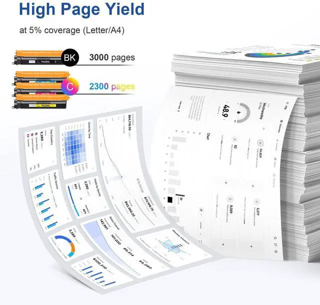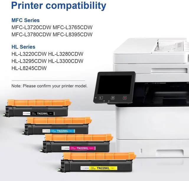 High Page Yield: Up to 3, 000 pages per TN229XL Black Toner Cartridge, up to 2, 300 pages per TN229XL Color Toner Cartridge (at 5% coverage of A4 paper) ^^ Compatible with Brother HL-L3280CDW, HL-L3220CDW, HL-L3295CDW, HL-L3300CDW, HL-L8245CDW Printer ^^ Compatible with Brother MFC-L3780CDW, MFC-L3720CDW, MFC-L3765CDW, MFC-L8395CDW Printer ^^
