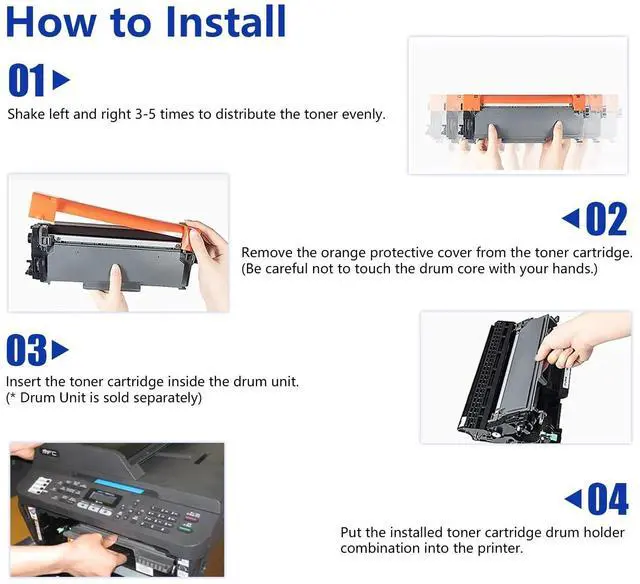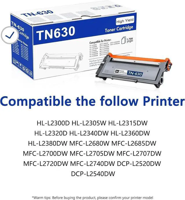 In the package: 2 Pack of High Yield TN-630 Black Toner Cartridges, Compatible Replacement for Brother TN630 (this package does not include drum unit) ^^ Toner cartridge are rigorously tested before shipment to avoid common printing problems, largely saving time and improving office efficiency ^^ The upgraded toner is comparatively finer and smoother, which won't cause any harm to your printer and at the same time ensures clear, colour-balanced, black-and-white prints. ^^ Printers that can use the