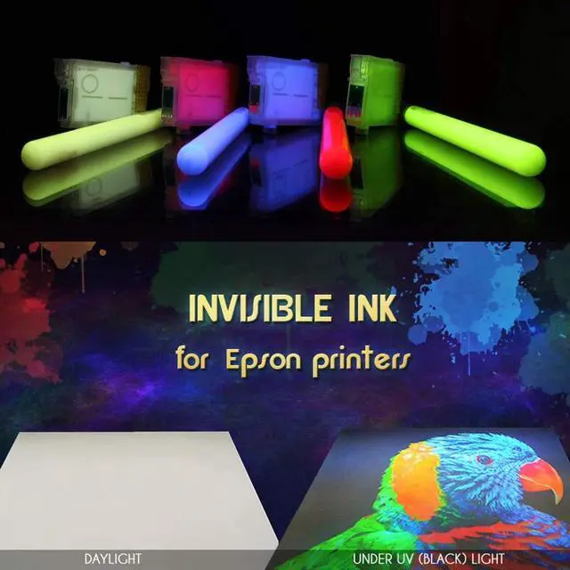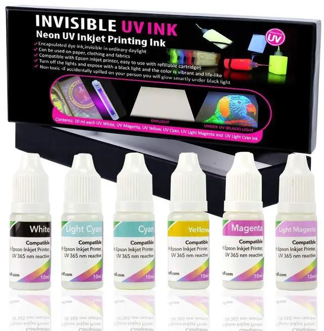 Invisible ink for inkjet printers that use "micro Piezo" printhead please ask us about compatibility before you purchase this item. Fill the ink into the cartridges as follows: WHITE ink -> Black ink cartridge CYAN ink -> Cyan ink cartridge LIGHT CYAN ink ->Light cyan cartridge MAGENTA ink -> Magenta ink cartridge LIGHT MAGENTA ink -> Light magenta ink cartridge YELLOW ink->Yellow ink cartridge Absolutely invisible under natural light, prints made with this ink become visible under any UV (ultra-violet) light. For best results use non fluorescent printing paper. Full list of instructions is included. This price it`s for 6 x 10 ml Invisible UV ink bottles(white, cyan, magenta, yellow, light cyan ans light magenta).