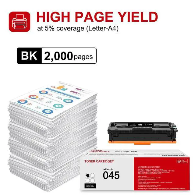 ^^ Page Yield: 2, 000 pages per CRG-045 BK Black toner cartridge at 5% coverage. ^^ Highly purified toner assures the long-lasting character of the cartridge which allows it to produce more pages comparing to similar products. ^^ Please make sure your printer series before buying. If you have any issues please find us immediately., we always being with you and provide satisfied answers.