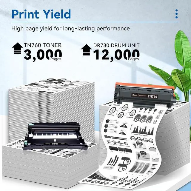 Page Yield: Up to 3000 pages per TN760 compatible toner cartridge replacement for for Brother printer, and 12000 pages per DR730 drum unit compatible drumreplacement for Brother printer (at 5% coverage) ^^ LEMERO SUPERX TN760 black toner cartridges and dr760 dr730 drum unit deliver brilliant quality printing with deep black and crisp text
