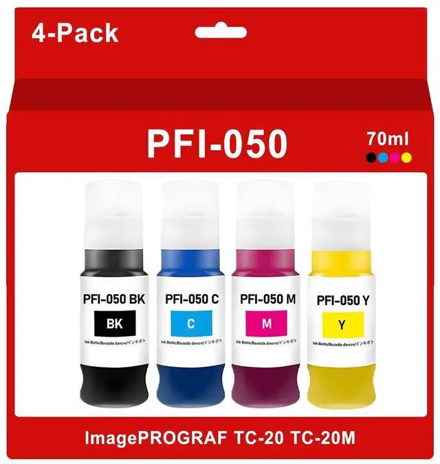 Package Contents: 1 x PFI050 BK (Black), 1 x PFI050 C (Cyan), 1 x PFI050 M (Magenta), PFI050 Y (Yellow). There are 4 bottles of 70ml of ink in total ^^