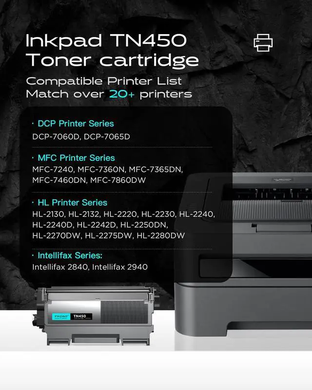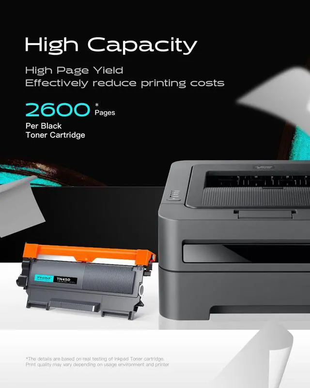 Compatible Printers: Compatible with 7060D, 7065D, HL-2130, HL-2132, HL-2220, HL-2230, HL-2240, HL-2240D, HL-2242D, HL-2250DN, HL-2270DW, HL-2275DW, HL-2280DW, Intellifax 2840, Intellifax 2940, 7240, 7360N, 7365DN, 7460DN, 7860DW Laser Printer. ^^ Cartridge Yield (approx. ): Higher capacity and Print More with iNKPAD Compatible TN-450 TN-420 toner cartridges, 2600 pages per black at 5% coverage.