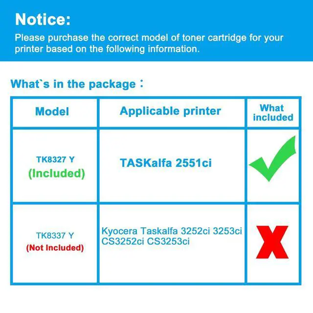 Reliable Quality: LCL TK8327 cartridge uses high quality toner, toner particle size distribution, good mobility, high transfer rate, resulting in a clear image and high gloss print effect; Printing efficiency is high, waste powder rate is low, so as to ensure sufficient page yield.