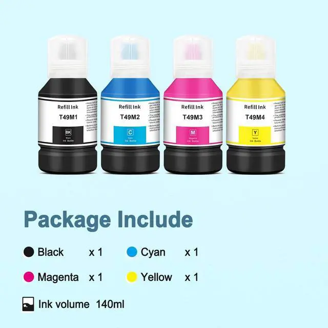 Package Contents: 1 x T49M1 (Black), 1 x T49M2 (Cyan), 1 x T49M3 (Magenta), 1 x T49M4 (Yellow). There are a total of 4 bottles of T49M heat transfer ink, each with a capacity of 140ml ^^