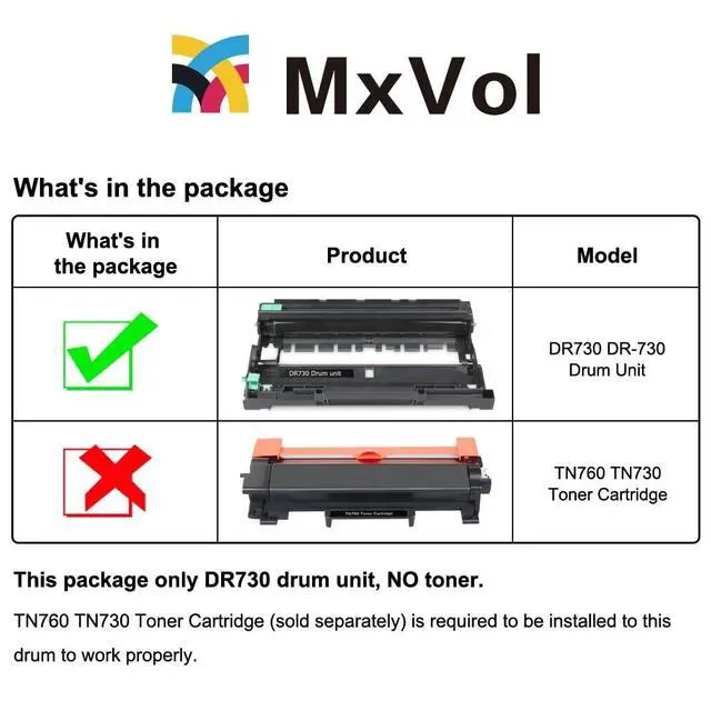 Note: The item is only the DR730 drum unit, not contain toner. You need to use with TN730 TN760 or TN770 toner cartridge. ^^ Package Contents - 2 Pack compatible for brother DR730 DR-730 drum unit (NOT TONER). ^^ Drum DR730 Perfect Compatible with Brother Printer HL-L2350DW HL-L2395DW MFC-L2710DW DCP-L2550DW MFC-L2750DW MFC-L2750DWXL HL-L2370DWXL HL-L2390DW HL-L2370DW MFC-l2730DW. ^^ DR-730 Drum Page Yield - Black 12, 000 Pages at 5% coverage ISO/IEC 19752 (letter/A4). ^^ MxVol DR730 After-sales Service - We always stand by for your needs, even though refund window is close.