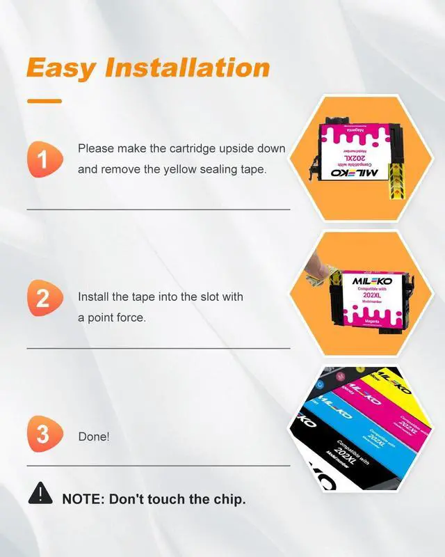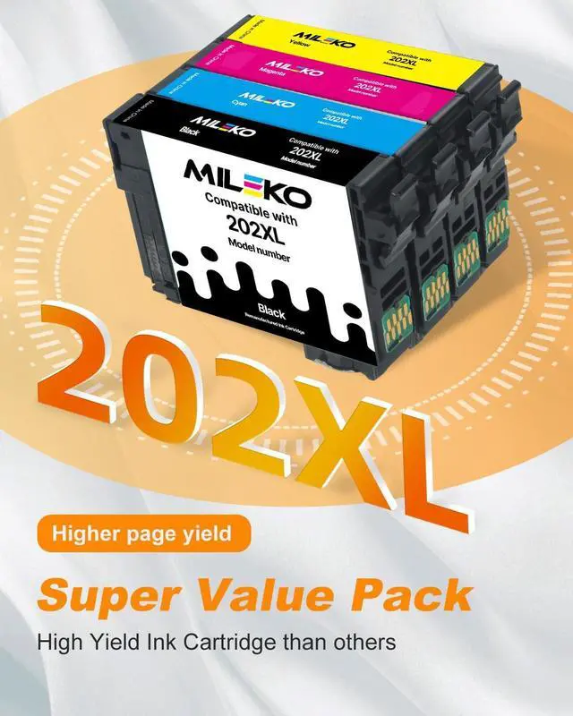 T202 XL Ink Printer Compatiblity: Work with Epson WorkForce WF-2860, Compatible with Epson Expression Home XP-5100 All-in-One inkjet Printer. ^^ 202 XL Cartridge Pages yield (approx. ): Up to 550 pages per 202XL High Capacity black ink cartridge, 470 pages per 202XL color ink cartridge (at 5% coverage) ^^ MILEKO 202XL ink cartridges ideal for quality printing. Our 202 202XL T202 XL ink cartridges undergoes a strict experiment to ensure crisp black text and vibrant color image.