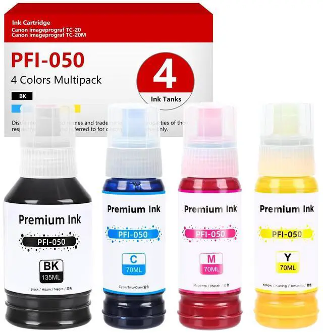 Package Contents: 4 Pack Compatible Canon PFI-050 Ink bottles (PFI-050BK, PFI-050C, PFI-050M, PFI-050Y), Pigment Ink.
