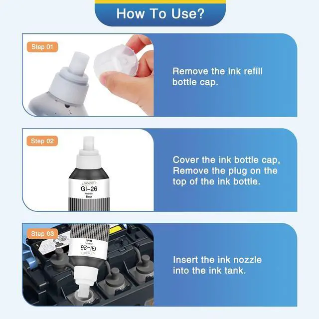 Product Name: compatible replacement for canon GI-26 GI26 GI 26 ink bottles, compatible for canon MAXIFY GX6021 ink refill, compatible for canon MAXIFY GX7021 ink refill, compatible for canon MAXIFY GX7020 ink refill, compatible for canon MAXIFY GX6020 ink refill, compatible for canon MAXIFY GX5020 ink refill, compatible for canon MAXIFY GX4020 ink refill, compatible for canon MAXIFY GX3020 ink refill, MAXIFY GX6021 GX7021 GX7020 GX6020 GX5020 ink bottles, MAXIFY GX4020 GX3020 GX6120 GX7120 GX5120 Megatank ink bottles ^^ Printer Models Replacement for