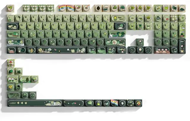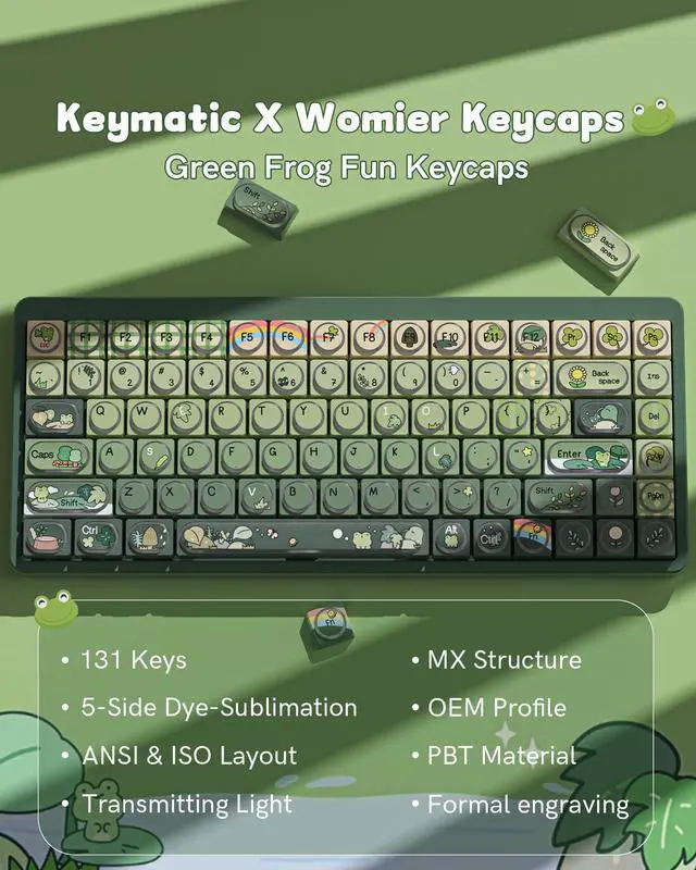 Charming Frog-Themed Natural AestheticThe Keymatic Green Frog Keycap Set showcases a tranquil post-rain ecosystem with playful raindrops, cute frogs, and delicate flowers; these frog keycaps blend cuteness with nature, making your keyboard keycaps a unique decorative highlight. ^^ High-Density PBT Material for LongevityMade of premium high-density PBT material, the cute keycap set is scratch-resistant and not easy to yellow, ensuring the keyboard keycaps retain their original appearance and structural stability even after years of use. ^^ Five-Sided Dye-Sublimation for Fade-Proof DetailsEach keycap uses five-sided dye-sublimation, allowing patterns to penetrate the material; this ensures lasting legends that wont fade due to friction, keeping the cute keycaps vibrant.