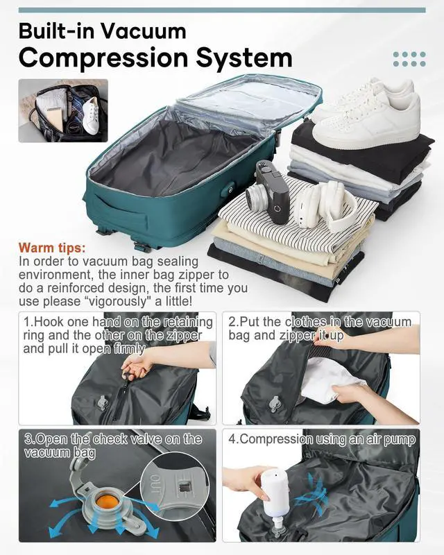 ^^ Comfort Meets Durability: This vacuum compression backpack features a comfortable, breathable honeycomb back pad, adjustable shoulder straps, and shock-absorbing foam to effectively reduce shoulder pressure and maintain comfort even during long trips. The vacuum travel backpack also comes with luggage straps that can be easily attached to your suitcase for a more convenient travel experience. Additionally, as a travel backpack carry on flight approved, it is very protable.