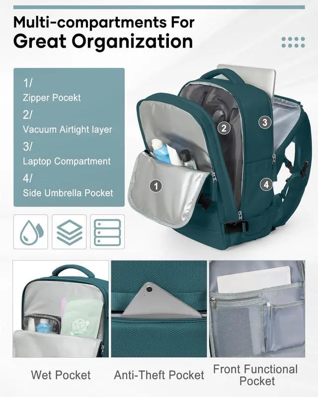 ^^ Efficient Organization: The vacuum-sealed backpack features a carefully designed layout with multiple compartments and pockets for efficient storage. The laptop compartment can accommodate laptops up to 15.6 inches in size. The backpack also features a built-in waterproof compartment pocket. This compartment is specifically designed for storing wet clothing, towels, and toiletries, ensuring your items stay dry and preventing liquid leaks or moisture from affecting other items.