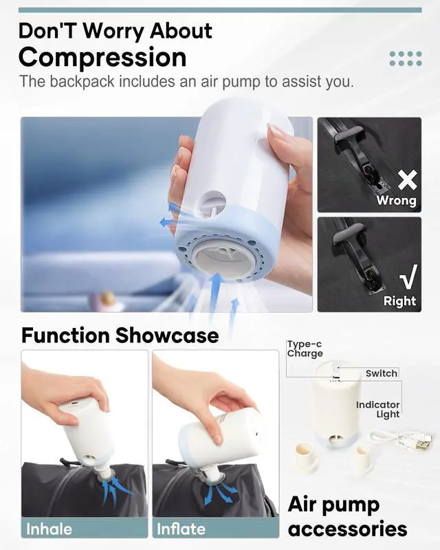 ^^ Vacuum Compression System: Vacuum-sealed backpacks use an advanced sealing compression system to maximize packaging efficiency and save space. The one-way valve on vacuum backpacks can release air using an electric pump or manual pressure, making them ideal for travelers who need large-capacity compression backpacks but don't want to increase their volume. Vacuum backpacks allow you to carry more items without worrying about space limitations.