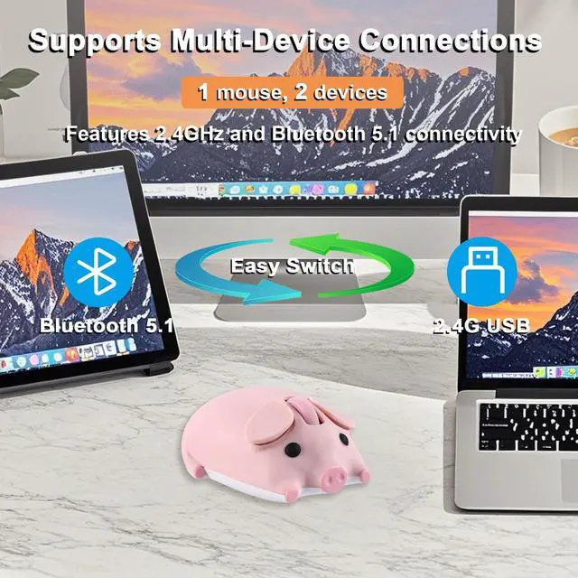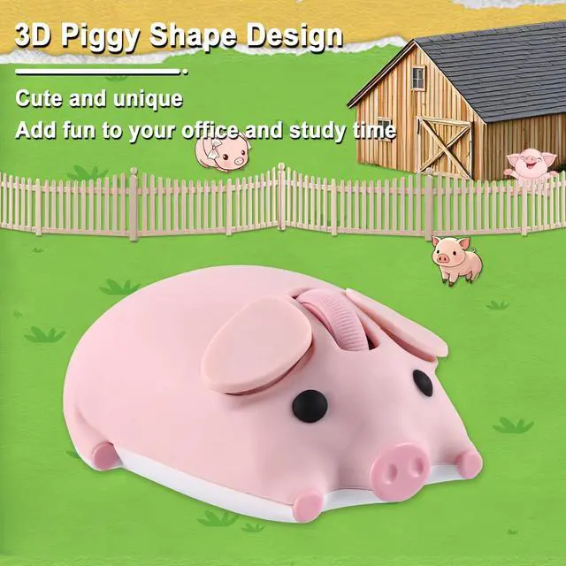 Cute Piggy Design - The unique and cute 3D Piggy shape of this wireless mouse Bluetooth is designed to be very eye-catching, adding a splash of color to your office study area and adding fun to the typing process. With this cute piggy mouse, kids will be more willing to take online courses. ^^ Sensitive & Efficient - This mouse for computer wireless features 1200 DPI resolution, high sensitivity, precise tracking, and quick response to help you work more efficiently. This optical mouse wireless is powered by 1*AA battery (Note: Battery not included). ^^ Dual Mode Connectivity - This silent mouse wireless uses advanced 2.4GH z wireless and Bluetooth connectivity to provide a strong and reliable connection over both technologies with an effective range of up to 10 meters. In USB mode, simply connect the kawaii mouse's USB receiver to your computer's USB port, flip the switch to 2.4G mode and wait a few seconds for it to work. In Bluetooth mode, the laptop mouse connects to Bluetooth devices via Bluetooth 5.1 by flipping the USB mouse switch to BT mode. Without the tangle of messy cables, everything is simple and organized.