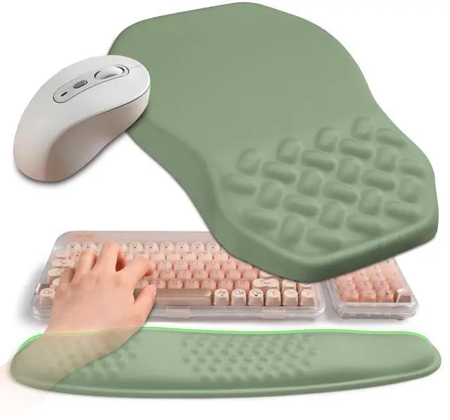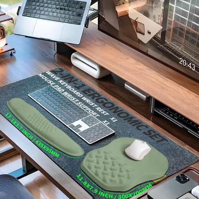 Ergonomic SetWave Keyboard Wrist Rest x1( 17.1 x 3.7 inch, 435x95mm) and Massage Slope Mouse Pad Wrist Support x1( 11.8 x 7.9 inch, 300x200mm), ergonomic curvature design optimization, more in line with the natural position of the shoulder during work, alleviates carpal tunnel syndrome and wrist pain ^^ Wave and SlopThe unique wave curve adjusts the height difference between the wrist and the keyboard. The 165 double-slope mouse pad closely fits the wrist curve support, adjusts the joint and wrist posture, relieves the pressure on the elbows and shoulders during long-term work, and keeps you in the most comfortable state ^^ High Density Smooth FabricHigh density abrasion resistance smooth fabric, easy to slide and improve cursor signal reflection accuracy, accurately capturing sensor displacement distance and precise positioning ^^ Unibody Memory FoamAdopting the pressure integrated molding process, it has the advantages of strong support and slow rebound, soft and comfortable, and will not collapse during long-term use ^^ Micro Stick PU BaseThe base is made of anti slip PU material with slight adhesive properties, firmly attached to the desktop to prevent accidental movement of the mouse pad and ensure that the mouse slides freely