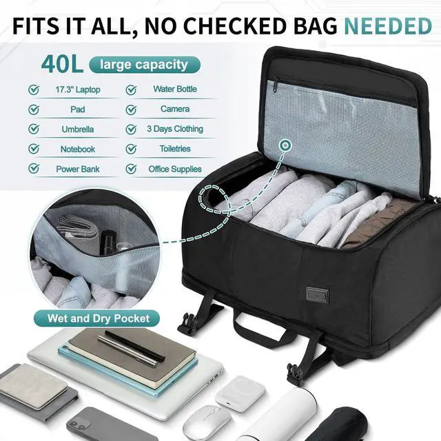 -SPACIOUS 40L ORGANIZED STORAGE- Measures 20.5 x 13.4 x9 inches. A large main compartment, multiple pockets, and a separate 17.3" laptop sleeve keep all your gear for a 3-5 day trip neatly organized and easy to find ^^ -QUICK AIRPORT SECURITY CHECK- Features a TSA-friendly laptop compartment that opens a full 180 degrees. This lay-flat design helps you fly through airport security without removing your electronics from the bag ^^ -DUAL USB-A & USB-C CHARGING- Stay powered on the go with built-in USB-A and USB-C ports. Simply connect your own power bank inside for a convenient way to charge your phone and other devices while walking ^^ -EASY ACCESS & VERSATILE CARRY- A quick-access front pocket opens directly to the main compartment for essentials.