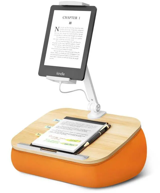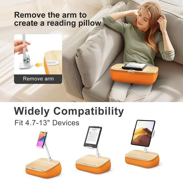 Introducing the ERGONOV Lap Beanbag Cozy Kindle Pillow Stand, designed for versatile comfort and hands-free convenience. This innovative stand features a beanbag base with a spacious wooden panel for stability, ideal for placing on laps, beds, or sofas without discomfort. Its detachable tablet arm adjusts 180 degrees, securely holding devices from 4.7" to 13" like Kindle, iPad, Phone. The 360 rotating clamp allows effortless switching between portrait and landscape modes, perfect for relaxed reading anywhere. Ideal for book lovers seeking ergonomic support and flexibility in various settings.