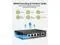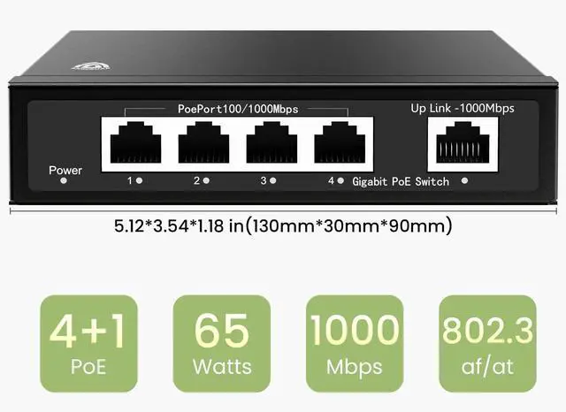 Uplink Port]: Unmanned PoE switch with 4 10/100/1000 Mbps RJ45 PoE+ ports and 1 Gigabit Ethernet Uplink port, 4 PoE+ ports providing up to 30W per port, total PoE power budget 65W.