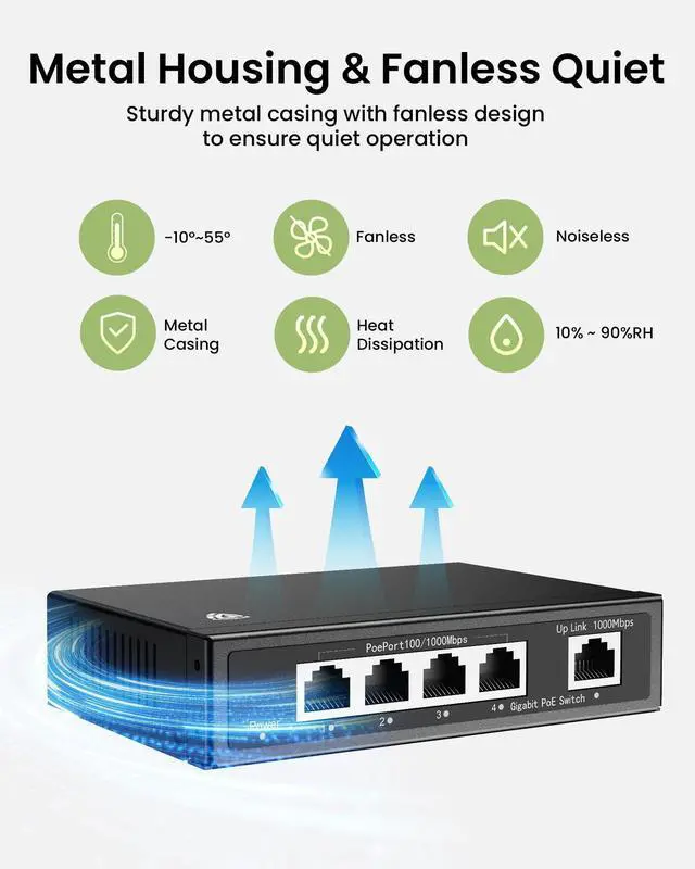 ^^ [PoE Auto Recovery]: This 4 port gigabit poe switch equipped with professional poe chip, it can intelligently detect the data exchange between the poe port and the terminal device. When an abnormality is detected, it will automatically restart and return to normal without affecting other ports, reducing maintenance costs.