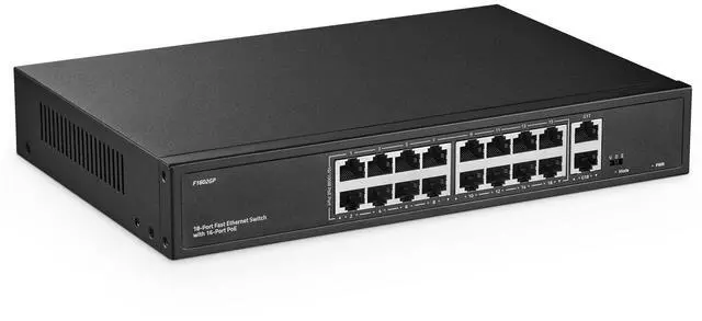 *Please note: it will not supply power to passive 24V PoE and NON-PoE devices. * ^^ Vlan Isolation & Extend DistancePorts 1-16 support VLAN port isolation and cannot communicate with each other, only communicate with uplink port 17-18 port, which can reduce network congestion, improve performance and safety; ports 1-16 support POE distances up to 250 meters, the rate is 10Mbps. ^^ Unmanaged Plug and PlaySupports automatic detection of power supply for POE devices, built-in power module, just connect the power cord, and connect to the device through the network cable, no other configuration is required, the LED indicator on the panel shows the status, the use and maintenance are very simple. ^^ Widely UsedMetal case, fanless silent, double side vents; with hanging ears, support desktop/wall/rackmount install. Stable POE and switching chips, can be used in various networks of home, office and business, including computer internet, security monitoring, wireless coverage, transmission access of multiple devices, etc.